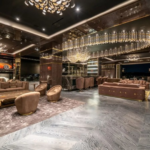 Motorized Fleetwood pocket doors open to the infinity edge pool with an incredible 23’ LED screen that rises at the touch of a button and a 30-person lounge area with firepit. Lower level provides a 6,000 SF entertainment area with 18’ ceilings, custom bar, commercial grade catering facilities, 1,050 bottle wine cellar, cigar lounge, sub-zero vodka tasting room, and an incredible 6-car automated display auto elevator. Additional amenities on lower level include outdoor lounge area, fitness center with climbing wall, spa, steam room with backlit Onyx, massage room, and sound-proof cinema. The second level features a grand primary suite with Italian hand-crafted floor to ceiling oak cladding, lounge area, coffee bar, spa-like bathroom with Calacatta gold marble, 100 SF shower, solid marble vanity, dual showroom-style walk-in closets, and private wraparound balcony with sweeping views, spa, firepit, and TV. The rooftop deck offers additional outdoor/entertainment space with built-in seating, firepit, TV, spa, and even more incredible views.
